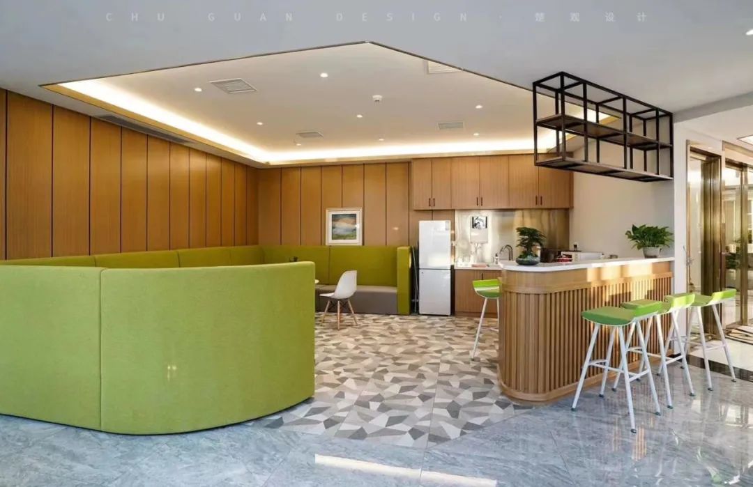 茶水间的设计风格上,考虑到茶水间的主要目的更偏向于员工休息功能,更偏向于选用舒适、暖色系的木材与灯光搭配,