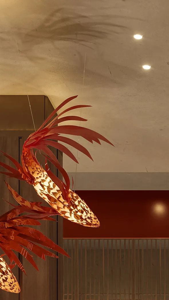 在空间设计中,加入光影的概念。颇有蕴意的山水挂画,让餐饮环境别具一格。罗汉松、枫叶植物加以点缀,融合原生态景观。空中悬挂的阵列式铜灯不仅仅给空间提亮,更赋予空间庄重的氛围。