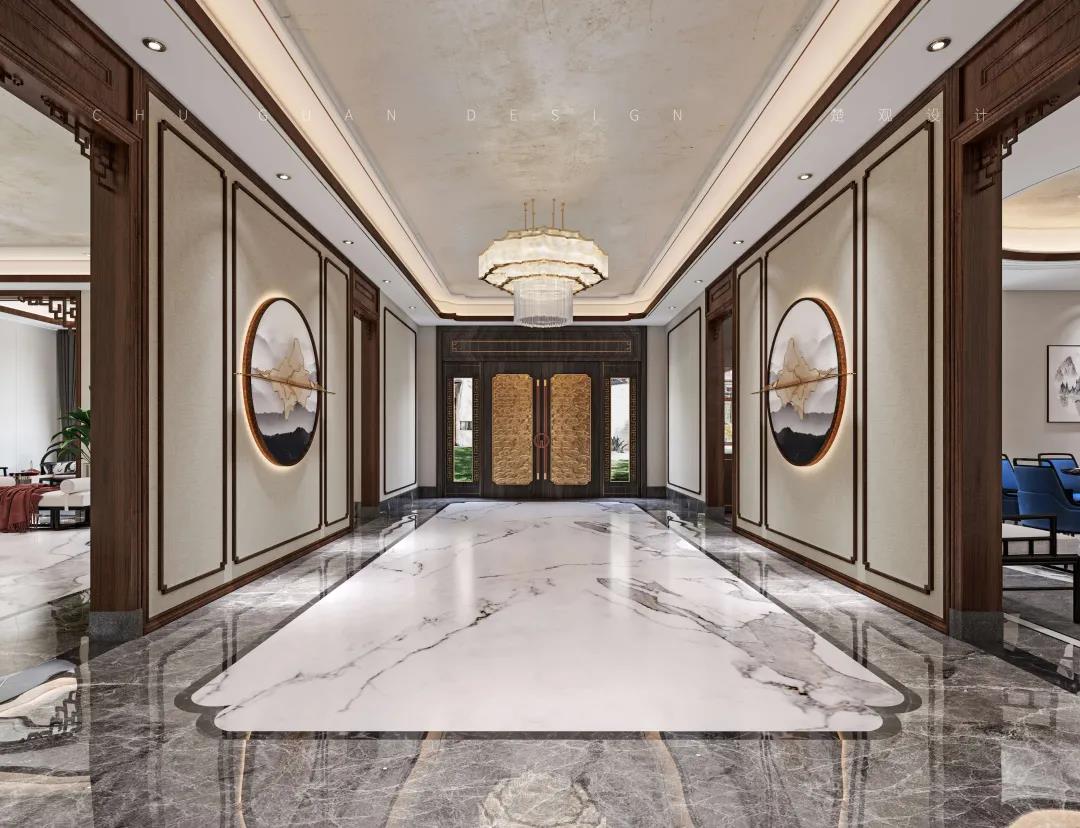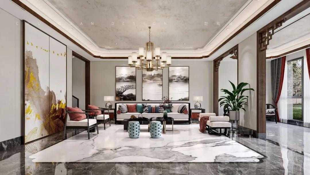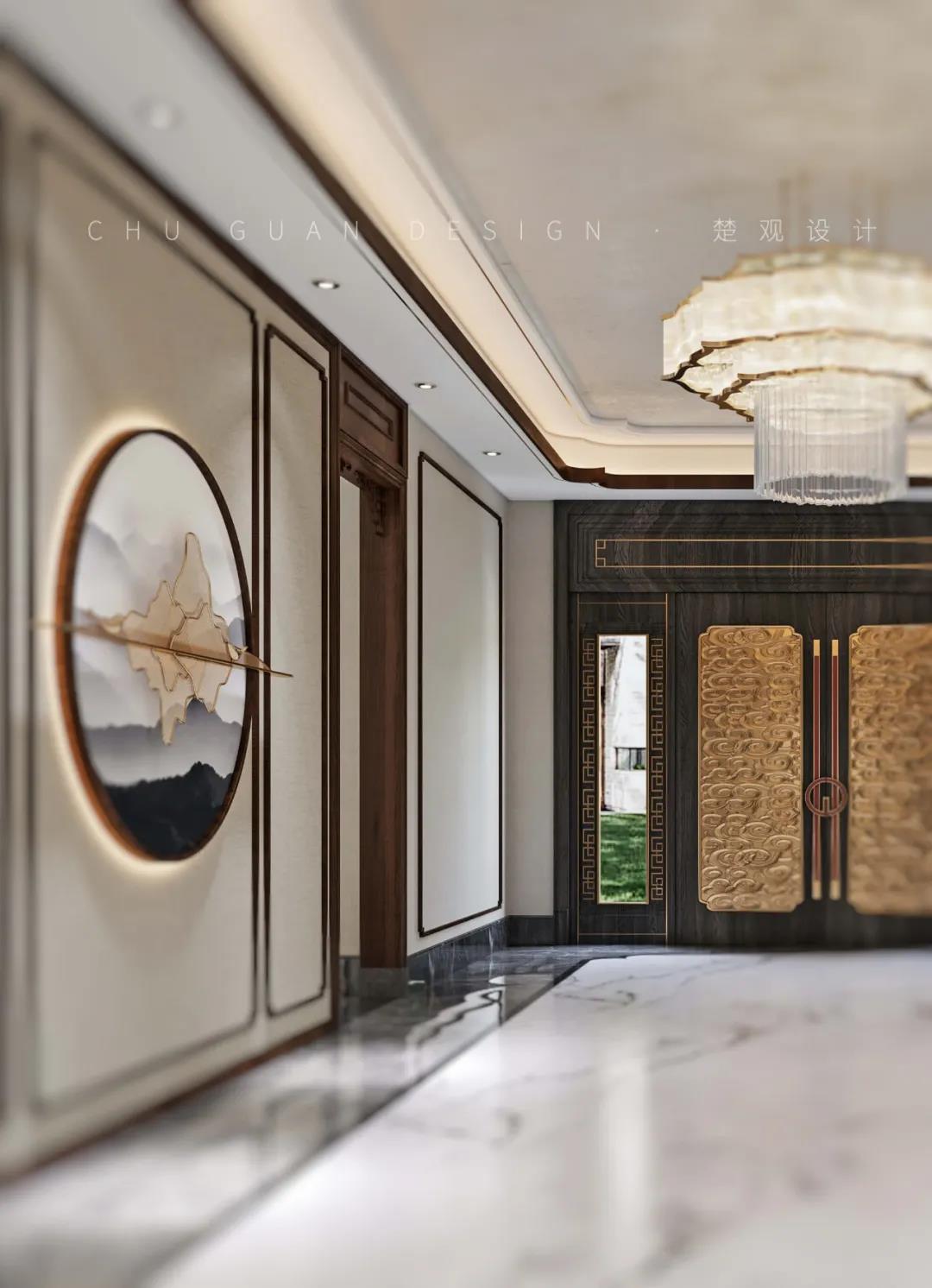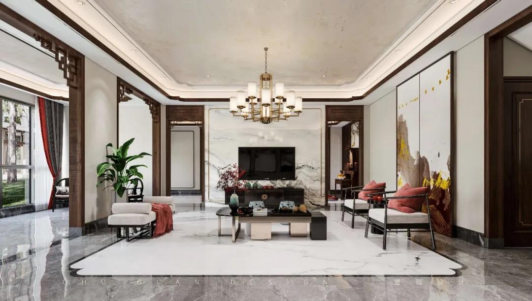 设计师被业主这种团结向上的家族情谊感动,将本案的设计思路定位为“新中式、大气场、微距离”,希望为业主打造东方美学与现代设计兼具的新中式美宅。
