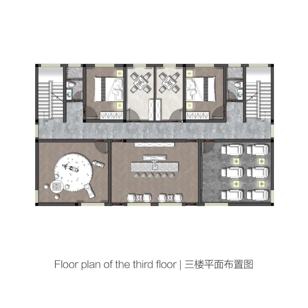 以素雅大气的绾、象牙白为基色;多处采用了传统的朱砂、靛蓝、雄黄等色。结合硬装灰色大理石、间隔以大面积的深色木饰面来统一协调。整体色调以朱砂红作为统领色,用小色块的整体点色进行贯穿。