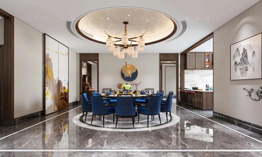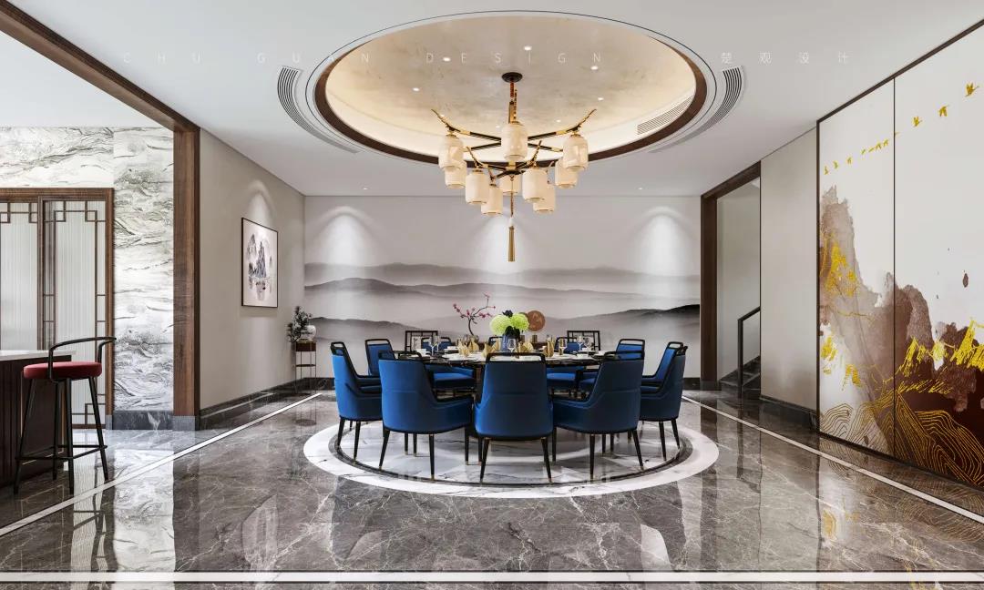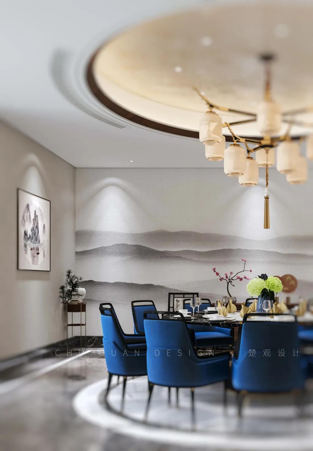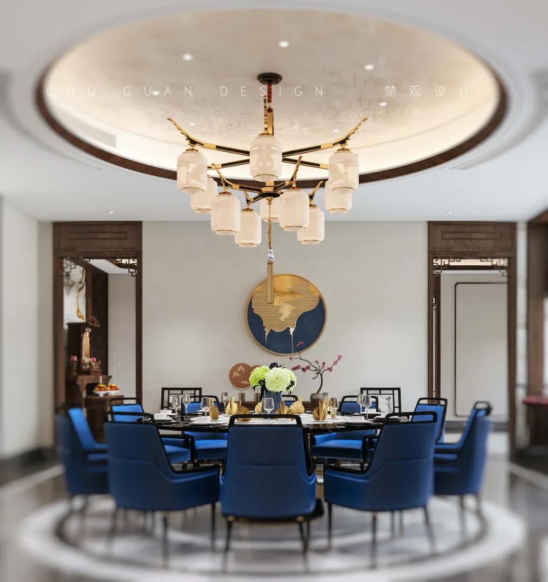 餐厅以蓝色搭配米白,圆形的造型象征着家庭和谐和团聚,宁静高雅的格调,简单而层层丰盈,线条凝练流畅,布局中正大方,彰显雄浑邈远的东方气魄。