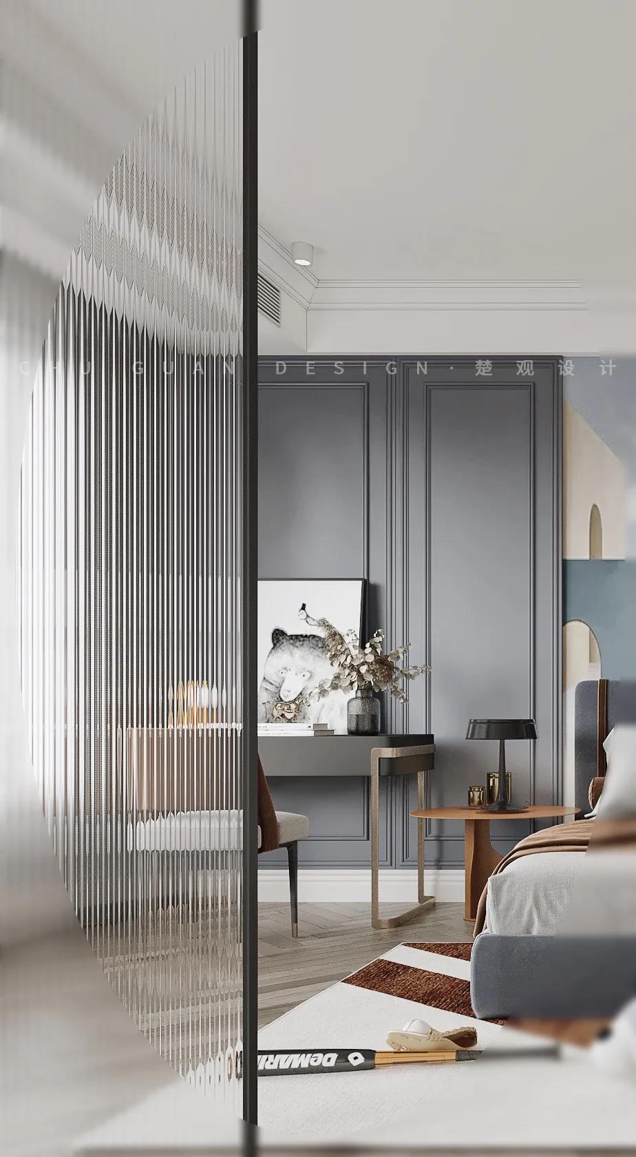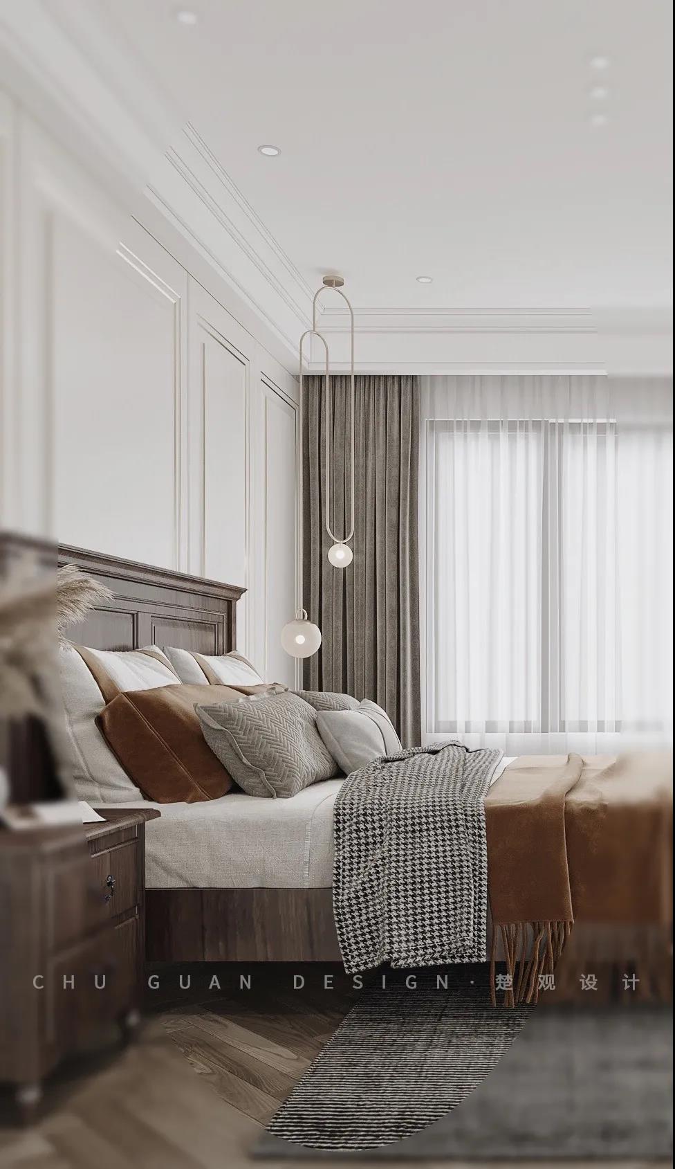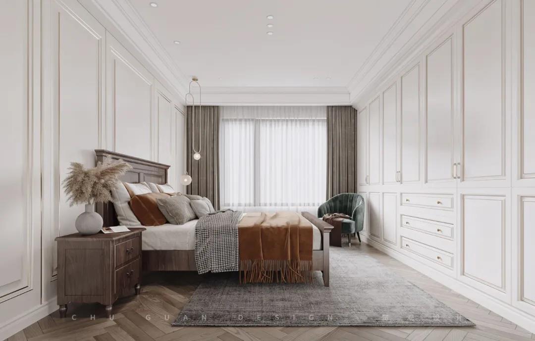 简约柔美的空间中,摒弃了传统美式中的一些元素,只保留经典元素,以线条呼应古典装饰语言,勾勒出拥有秩序美感的背景墙,整体氛围舒适清爽,既有美式的慵懒与优雅,