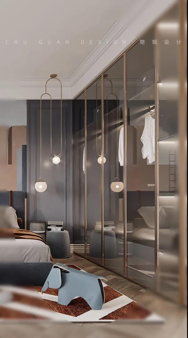主卧整体空间较大,在格局上划分出就寝区、洗漱区、储衣区。注重空间的灵活性与延伸感,整体白色系一体化设计,宽敞通透的加以金属线条点缀,增加了空间的层