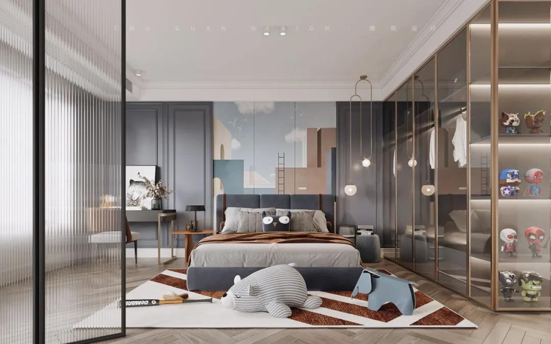 以睡眠为主的儿童房内,在视觉效果上以简净为主,深蓝色调与玻璃金属材质相结合,使空间视觉上更加舒缓轻便。透过色彩柔化空间表情,设计师将浪漫与童真自然