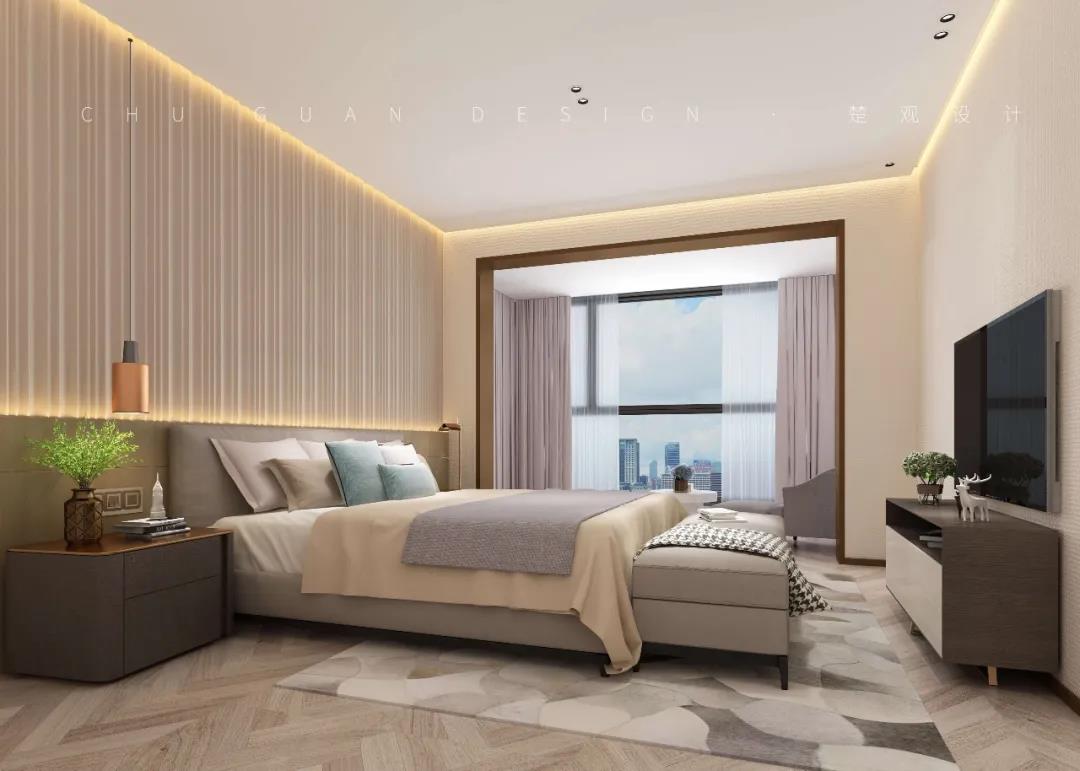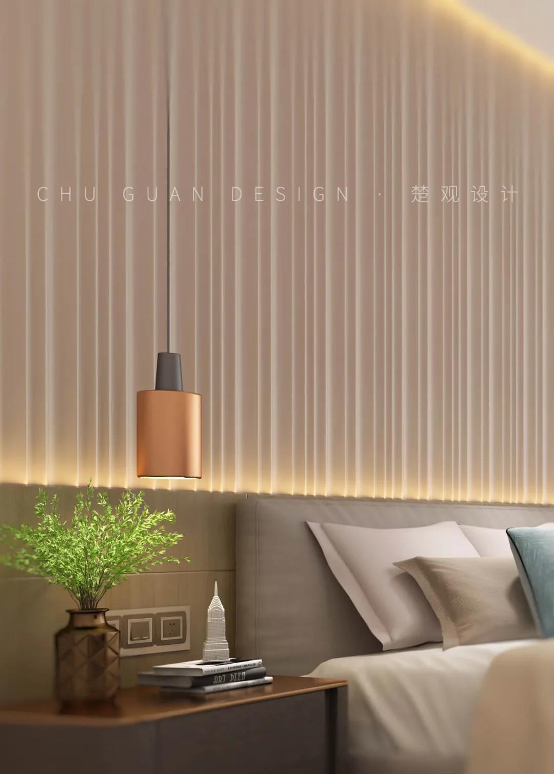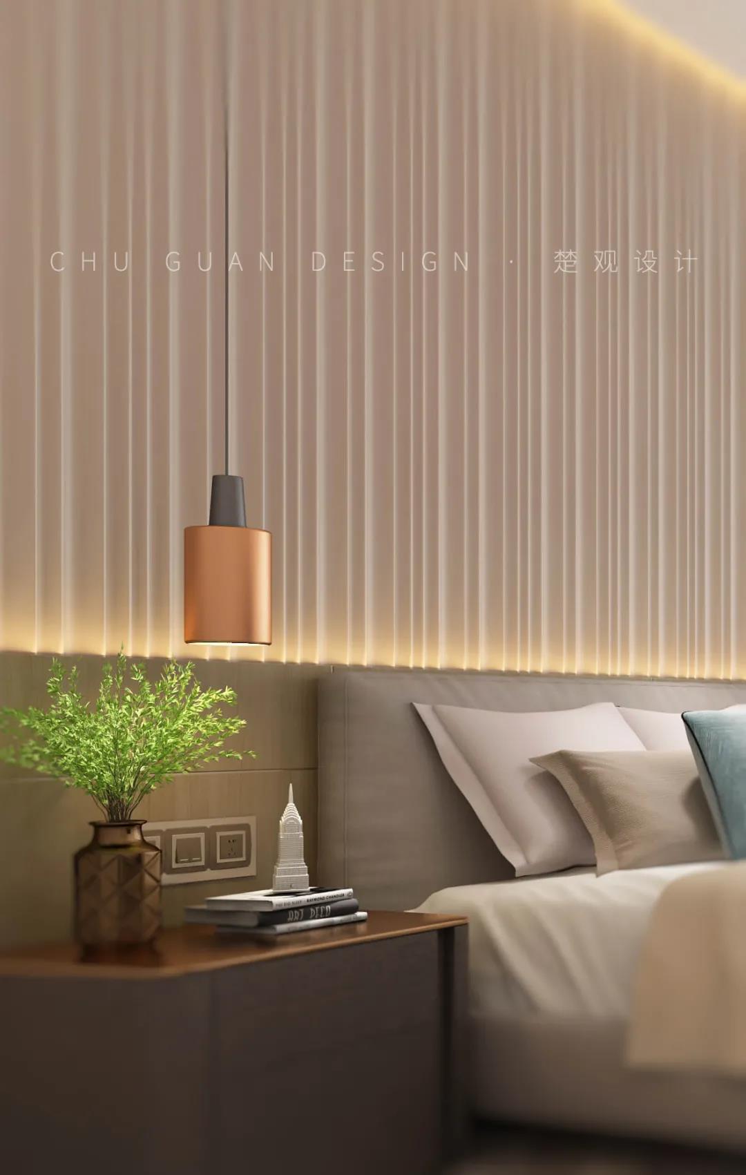 The design language of the master bedroom is rational and restrained. The wood colored bedside background has soft color and smooth lines. The customized bedside