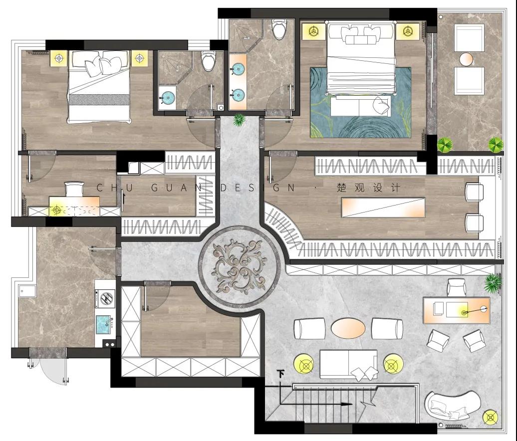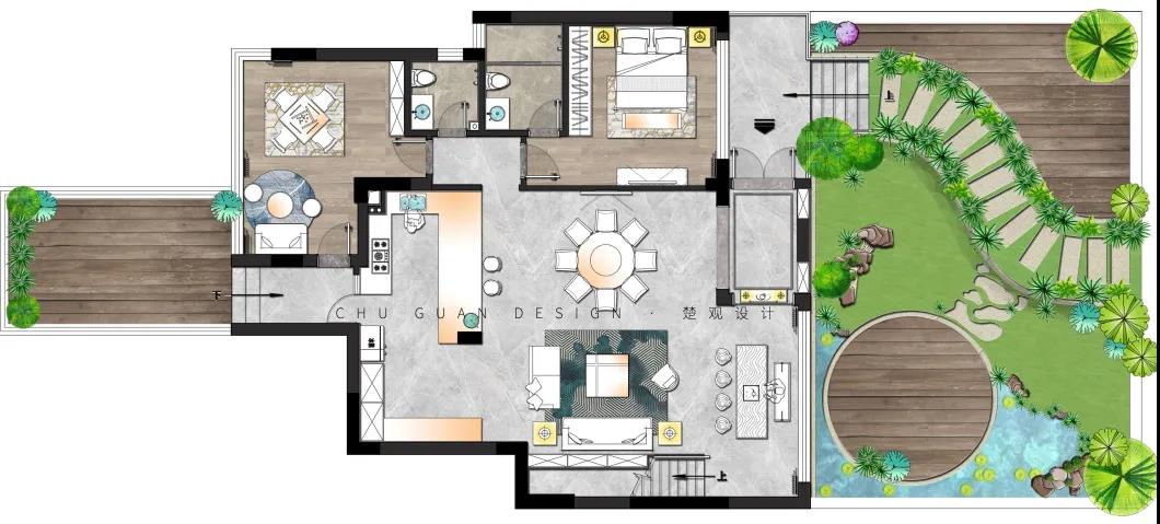 一种抛开冗余和繁杂回归简单的设计风格,充满大气又不失生活的烟火气息,沉浸在其中,顿感隔离了都市的繁杂与喧嚣,自然而然的身心彻底放松,沉浸式的空间换来精神上的释放。