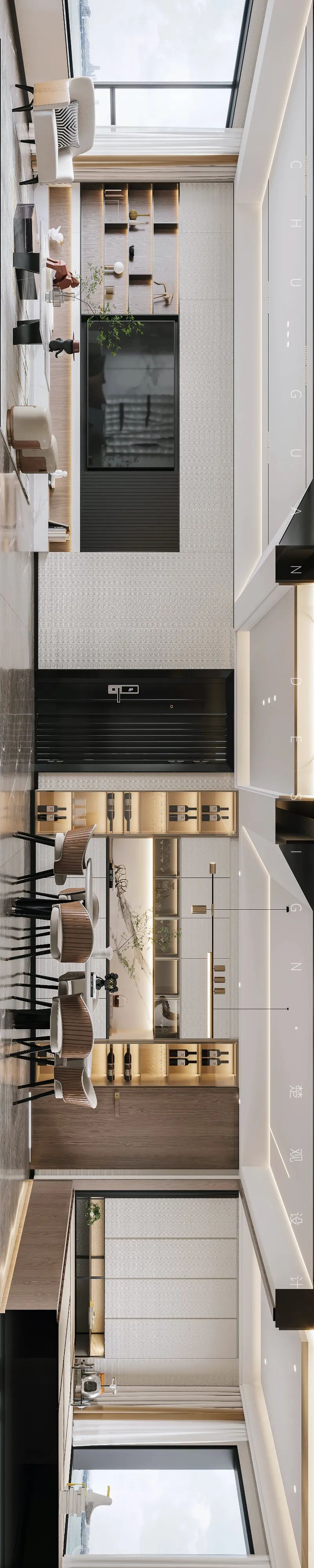 The connection of the guest restaurant makes the indoor moving line smooth and unimpeded. The restaurant continues the golden color echoing the color