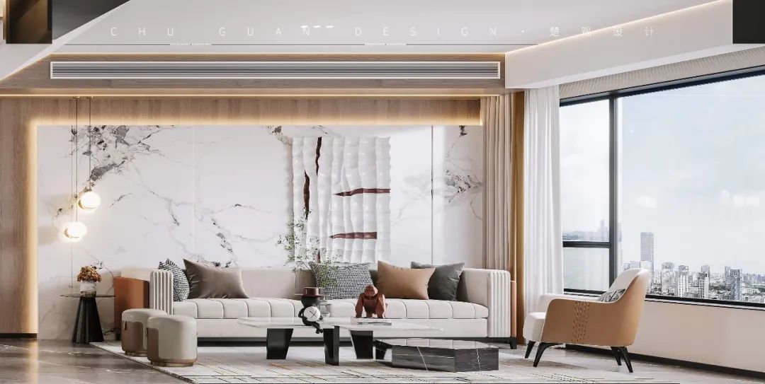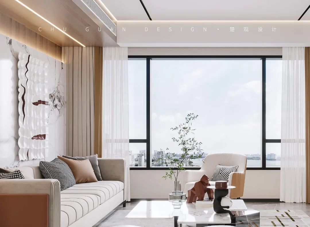 In this case, warm coffee color is mainly used, which is unified in elegant gray tone, showing dignity and generosity. The living room is a large bay with good
