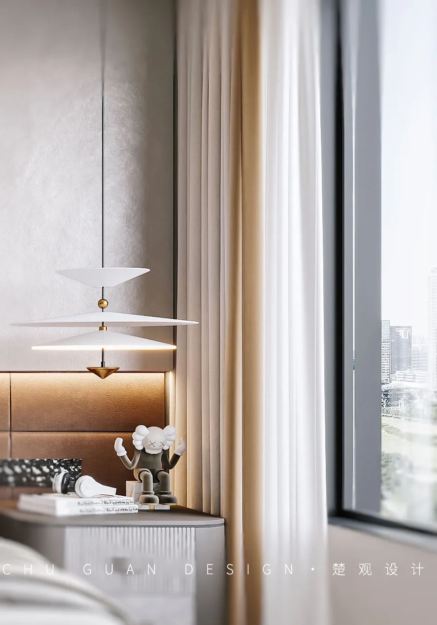 卧室内延用白色主调营造出简洁且柔和的格调,穿插的咖色使空间更为静怡,在安静的夜晚氤氲出丝丝睡意。夜幕降临时,在床头灯旁阅读一本枕边书,聆听内心最真实的话语,
